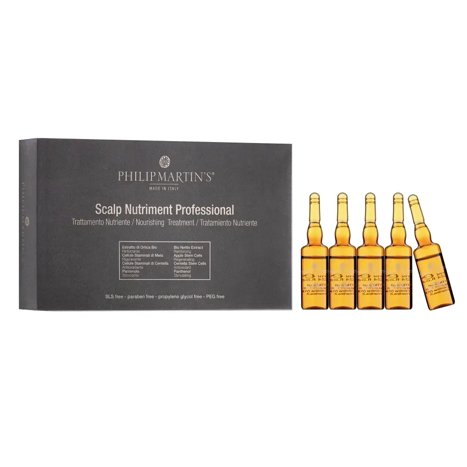 Scalp Nutriment Professional de la Philip Martin’s este un tratament profesional premium destinat îngrijirii scalpului sensibil, uscat sau iritat. Creat pe bază de ingrediente naturale și formule inovatoare, acest produs oferă hidratare intensă, hrănire profundă și echilibrarea microbiomului scalpului, contribuind la sănătatea optimă a pielii capului și la îmbunătățirea vizibilă a calității părului.