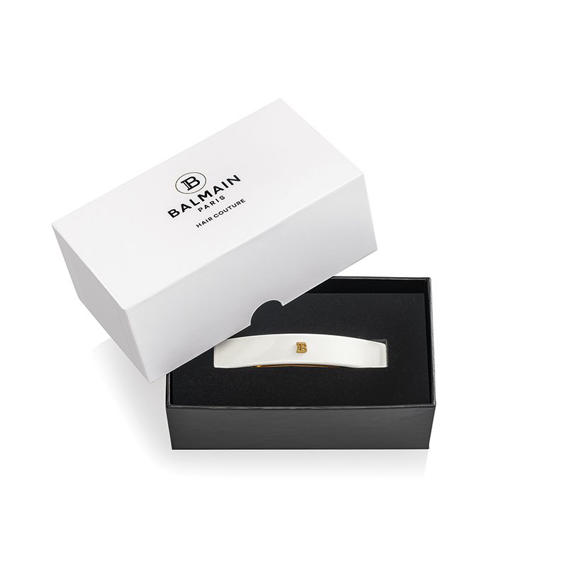 Заколка для волос Balmain Barrette pour Cheveux Medium White, выполненная вручную из ацетата целлюлозы, с логотипом «B» с покрытием из золота 18K и оригинальным французским зажимом. Обеспечивает надежную фиксацию, комфорт и элегантный вид для укладок half-up, пучка или низкого хвоста.